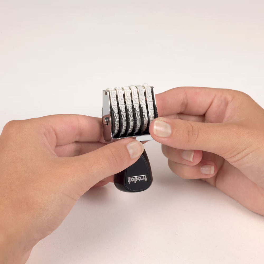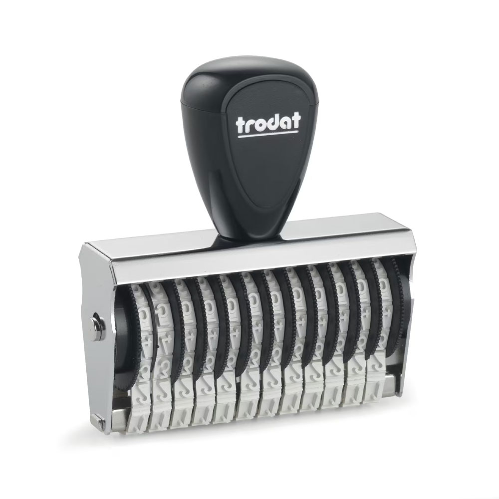 Der Trodat Classic Ziffernstempel 15412 ist ein klassischer Handstempel mit rechteckiger Abdruckfläche. Er liefert einen 12-stelligen Abdruck mit einer Schrifthöhe von 4 mm. Jedes Band umfasst die Ziffern 0–9 sowie zusätzliche Sonderzeichen. Durch den ergonomischen Griff liegt der Stempel angenehm in der Hand und ermöglicht eine einfache Anwendung.